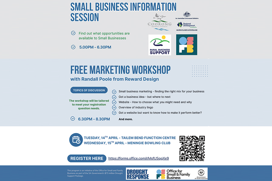 Find out what opportunities are available to small businesses with an information session from Rural Business Support. Date: Tuesday 14th April 2026 Time: 5pm – 6:30pm Venue: Tailem Bend Function Centre Type: In-person workshop Cost: FREE AND Free Marketing Workshop by Randall Poole from Reward Design. Overview of industry lingo, small business marketing and websites […]